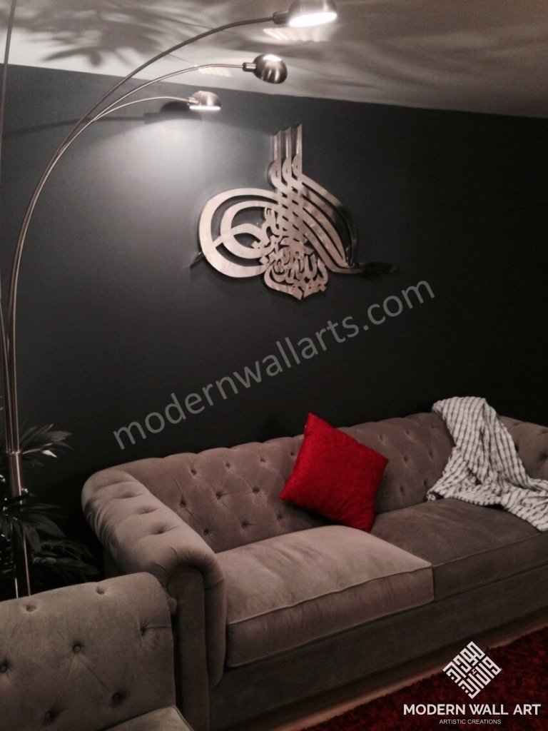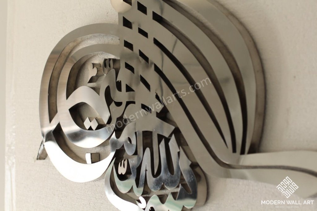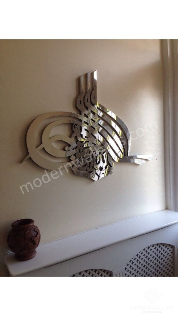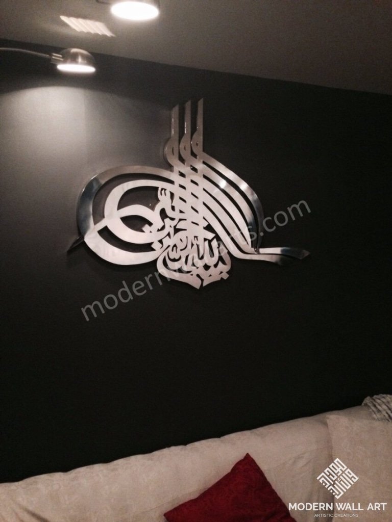 Item: Turkish Calligraphy Bismillah Material: Stainless steel Up for sale is a beautiful, unique, modern, contemporary, one of a kind stainless steel with a chrome finish Bismillah fixture. This fixture is very lightweight. However, the look is heavy. All the letters are in Arabic.