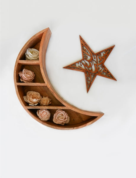 Wooden Moon shelf with calligraphy star that reads ""Mashallah". Moon size is 60cm x 20.                                         ...