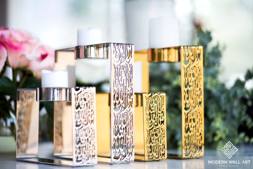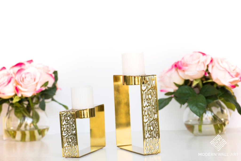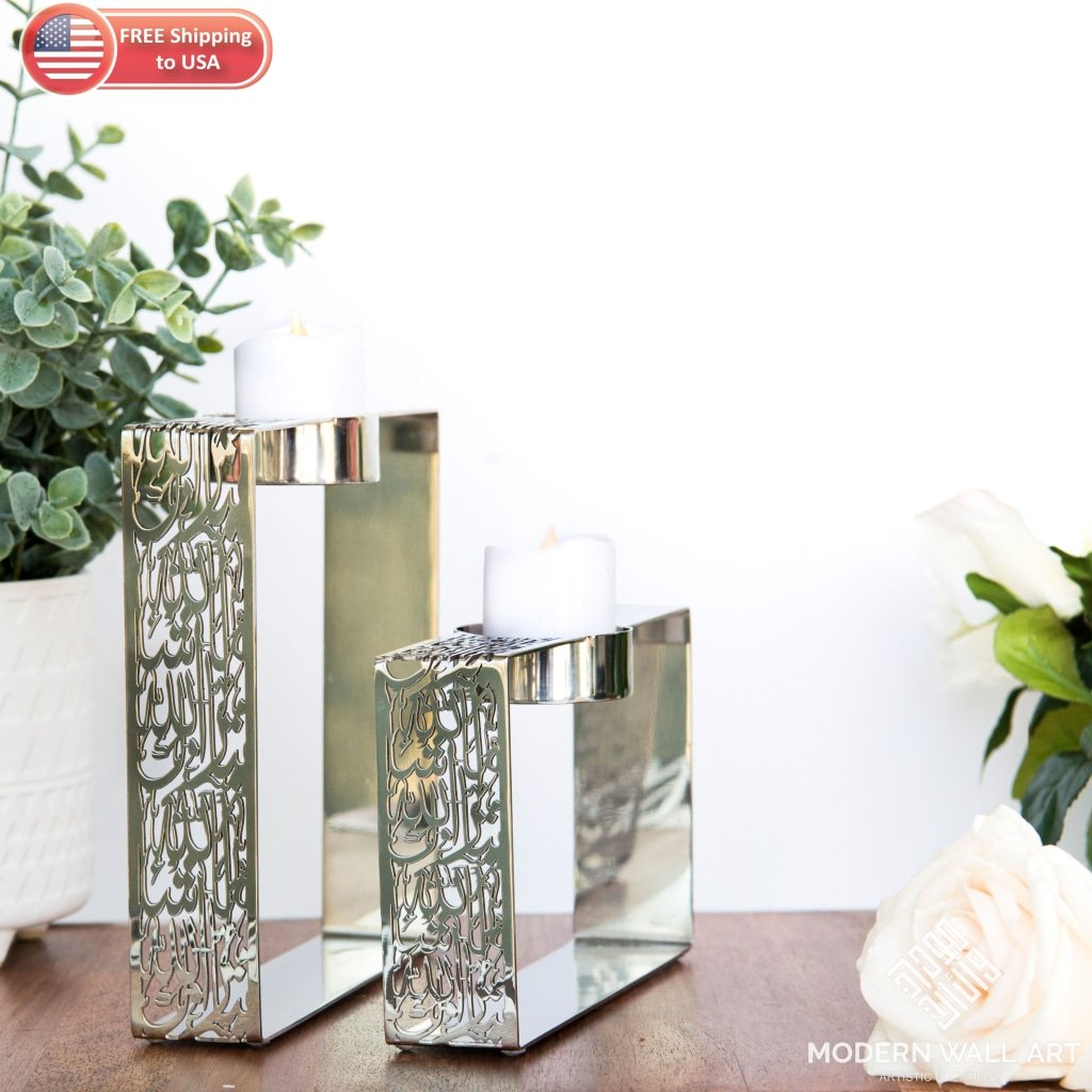 Item: Mashallah Pillar Candle Holders Material: Stainless Steel, it comes in a set of 2 Colors: GOLD/SILVER Description: Up for sale is beautiful high quality candle holders. Comes in a set of 2, they are...