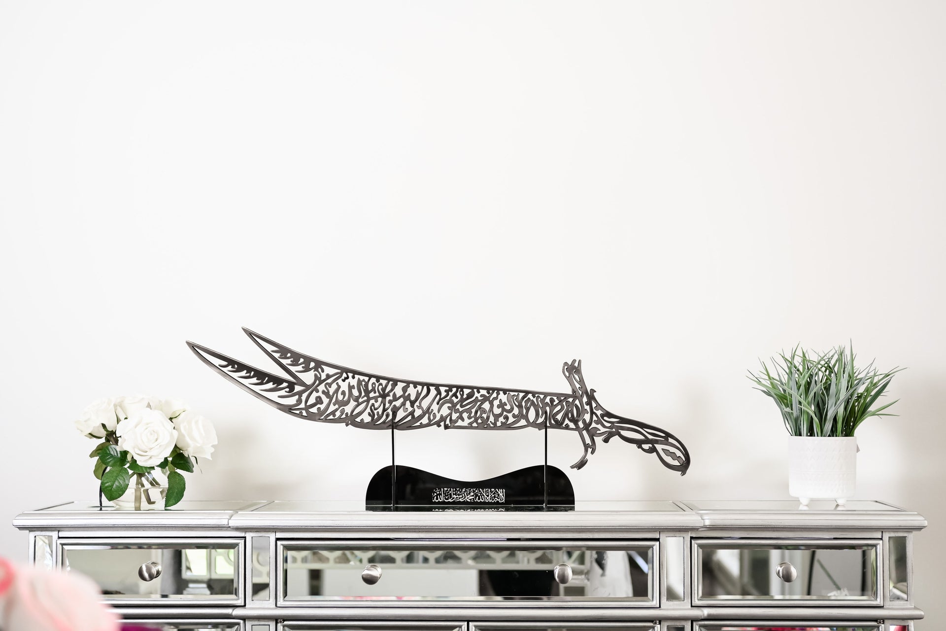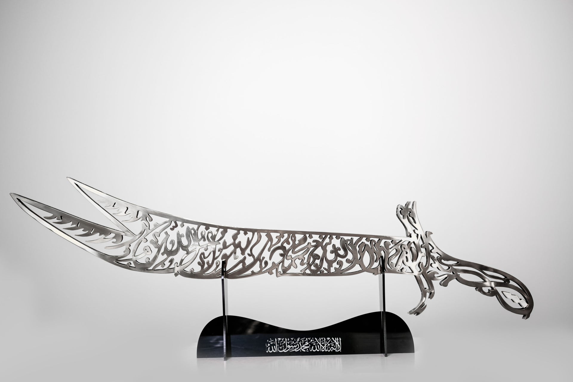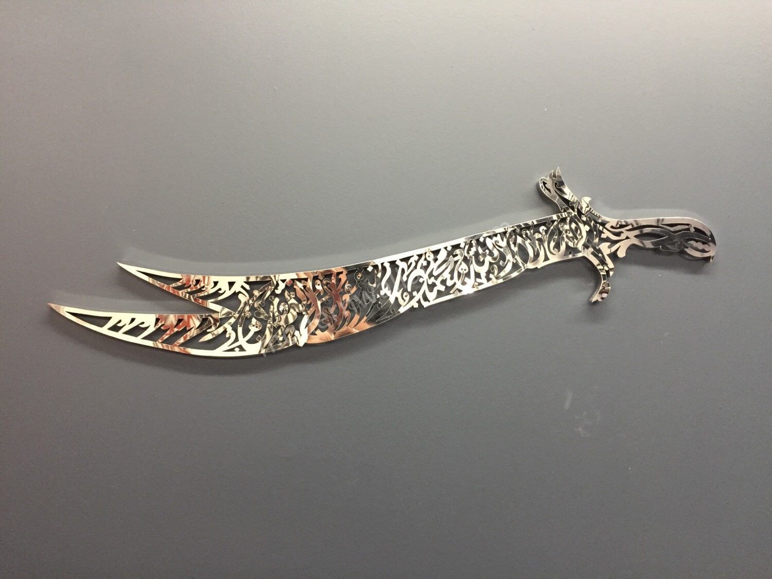 Up for sale is unique hand Hazrat Ali sword with the Shahada. This item is lightweight and can easily hang on a few nails or rested on a table. Item is hollow from back.