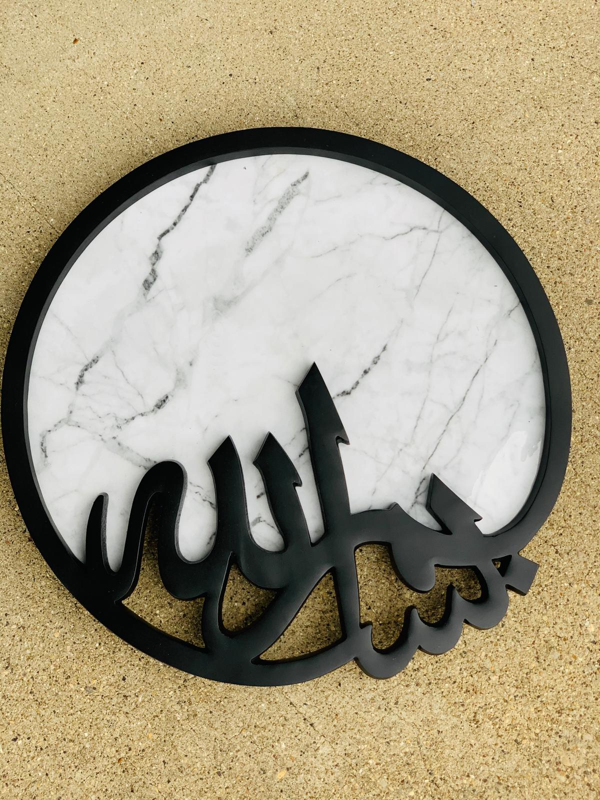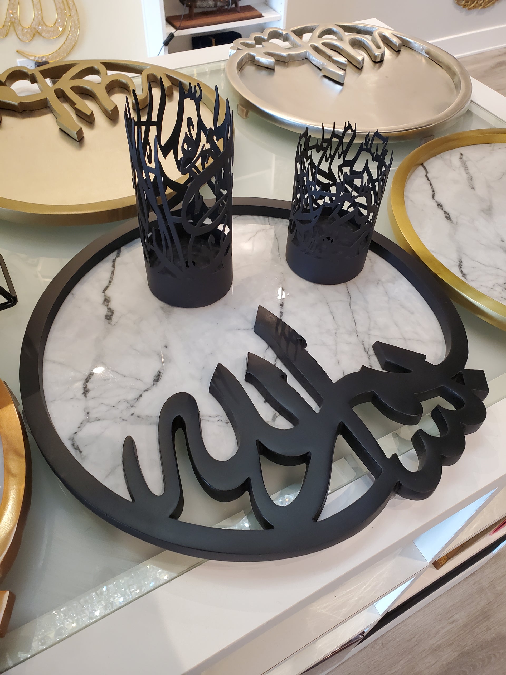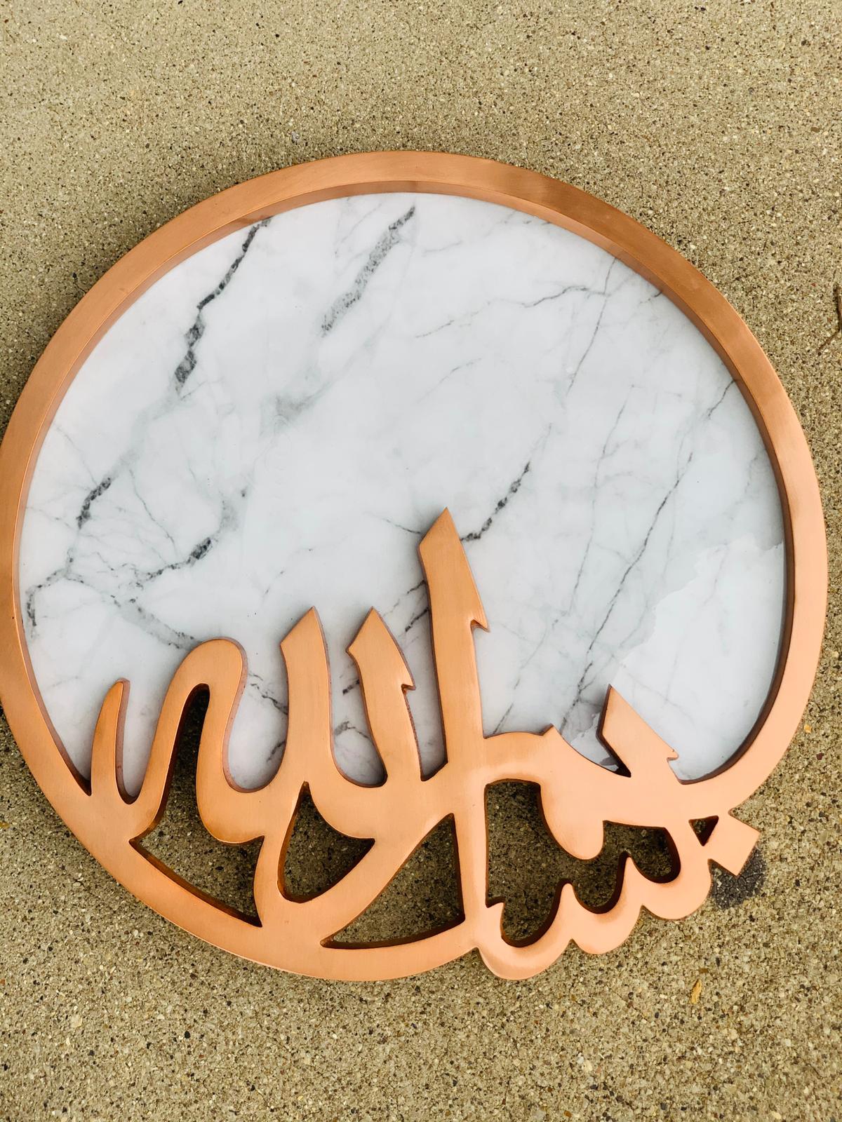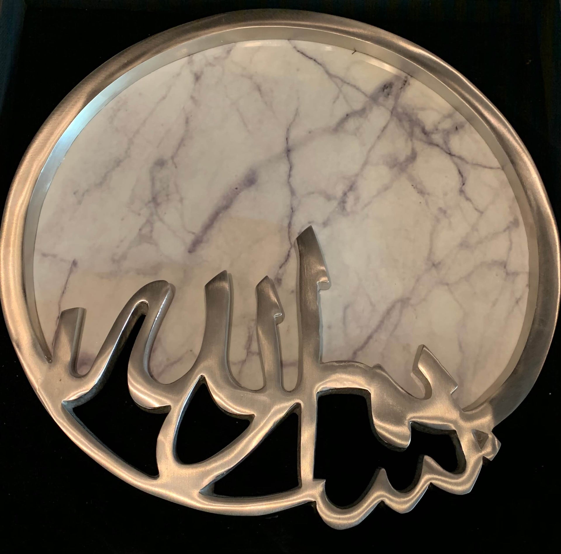 will ship in 5-6 weeks Size: Select from dropdown Material : wood/stainless steel color: Marble is a color and NOT the stone itself. These beautiful handmade Bismillah trays were originally designed for dates in Ramadan, but can be used throughout the year. We ship worldwide! Wood trays are not washable. They have to be cleaned with damp cloth; metal ones can be washed. If you have any question, please feel free to call 773 732 2911 or email sales@modernwallarts.com