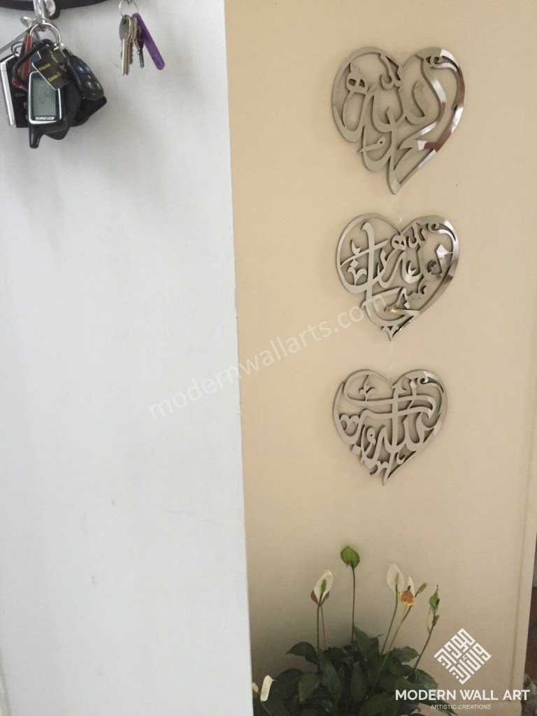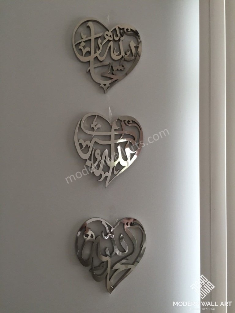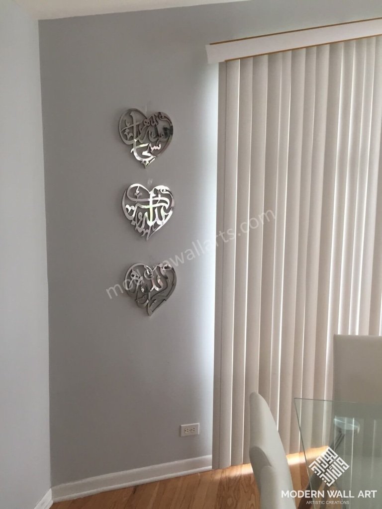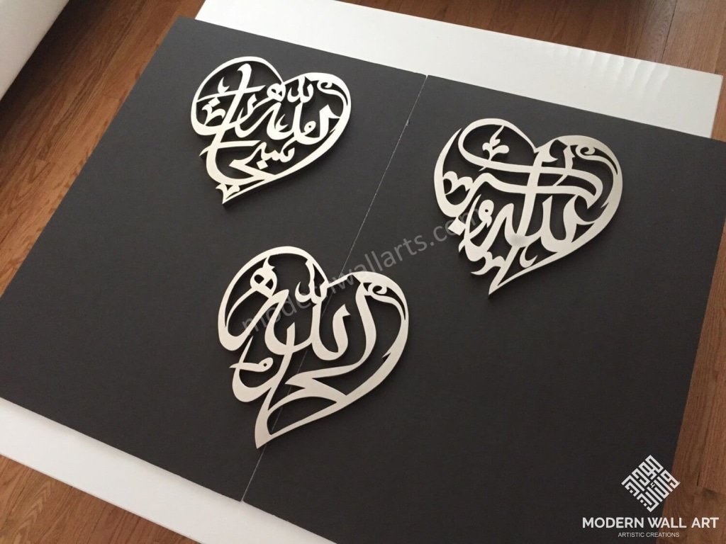 Made to order Item : 3 piece heart set (Alhamdullilah, Allah ho Akbar, Subhanallah) Material: metal/stainless steel Size: 12"w x 12"h per square Making time : 50-60 days Beautiful heart shape set that is ideal for any type of wall. Very modern and stylish. Lightweight and can easily be hung on any type of wall with nails. Disclaimer: Items are handmade and may come with a few imperfections, but they are usually hidden on the side and are not noticeable. Any questions? Feel free to ask. We also do custom work, so if you have a design in mind, contact us and we can discuss possibly creating it! Text, call, whats app me at +1 (224) 522-3297 or message me on Etsy. If you do not see your country in our listing, please contact us. We ship worldwide!