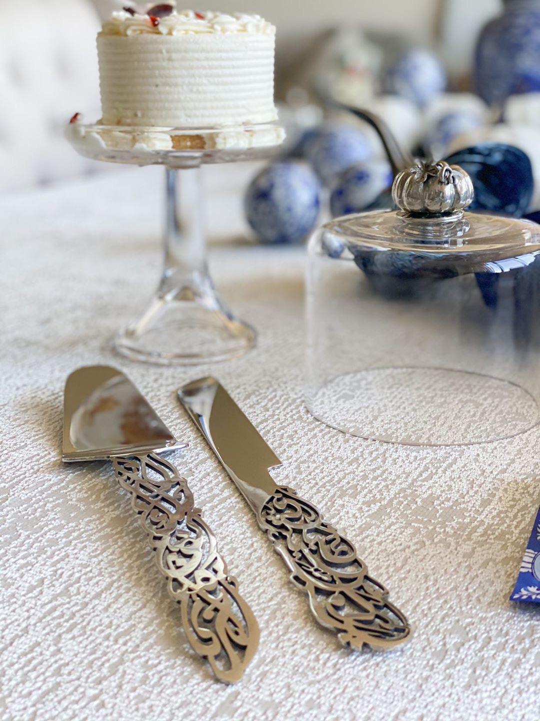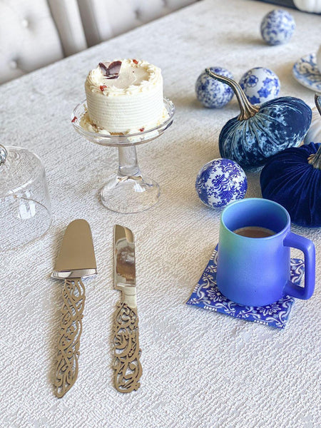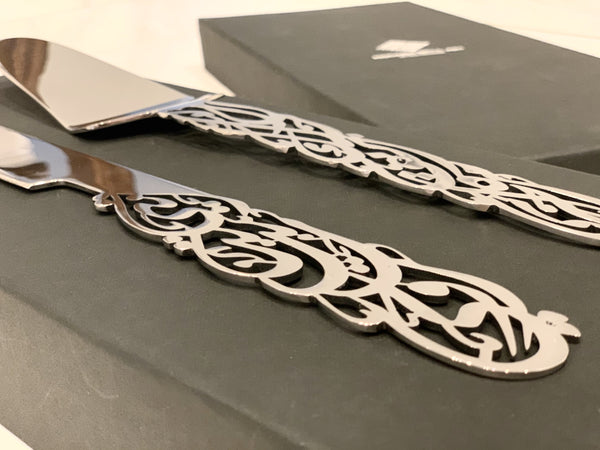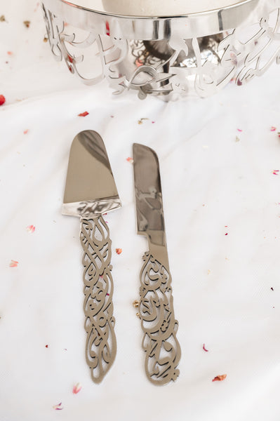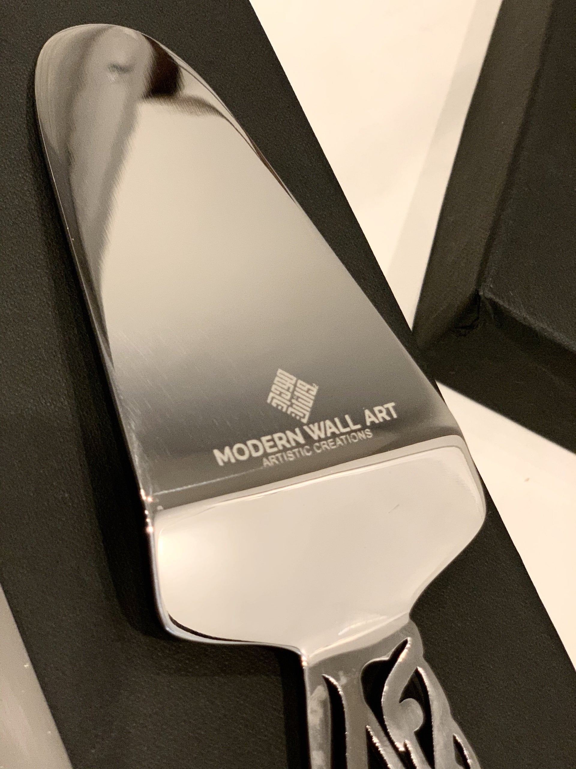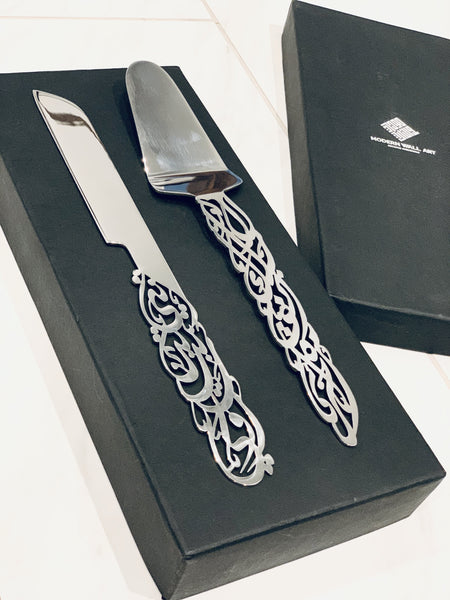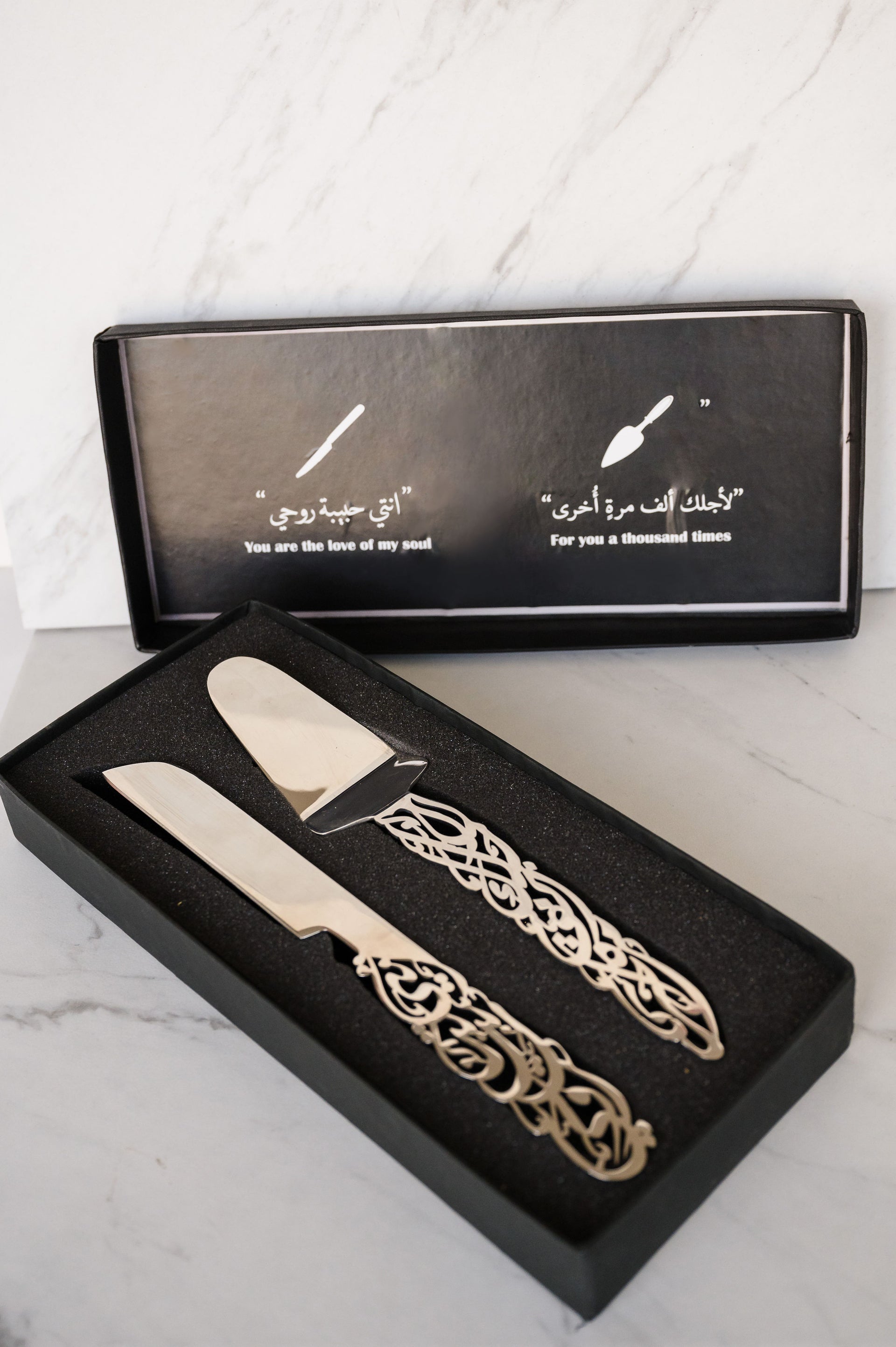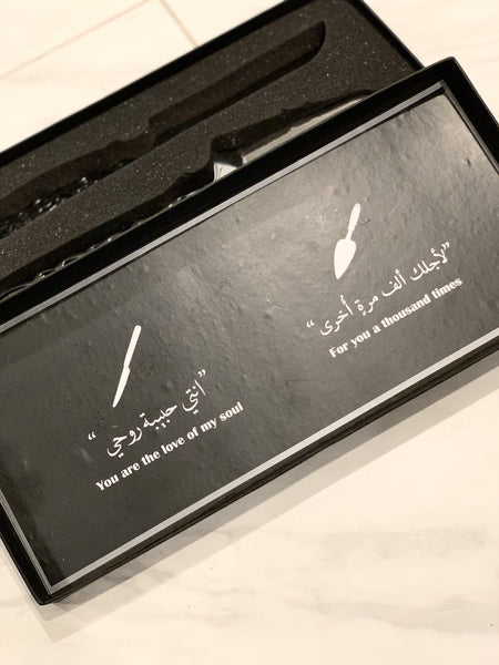 High quality cake server set with a gift box. Engraved with unique Arabic sayings. The knife reads “You are the love of my soul” and on the server it reads “For you a thousand times” in Arabic. These also make great gifts to future couples and Anniversary gifts
