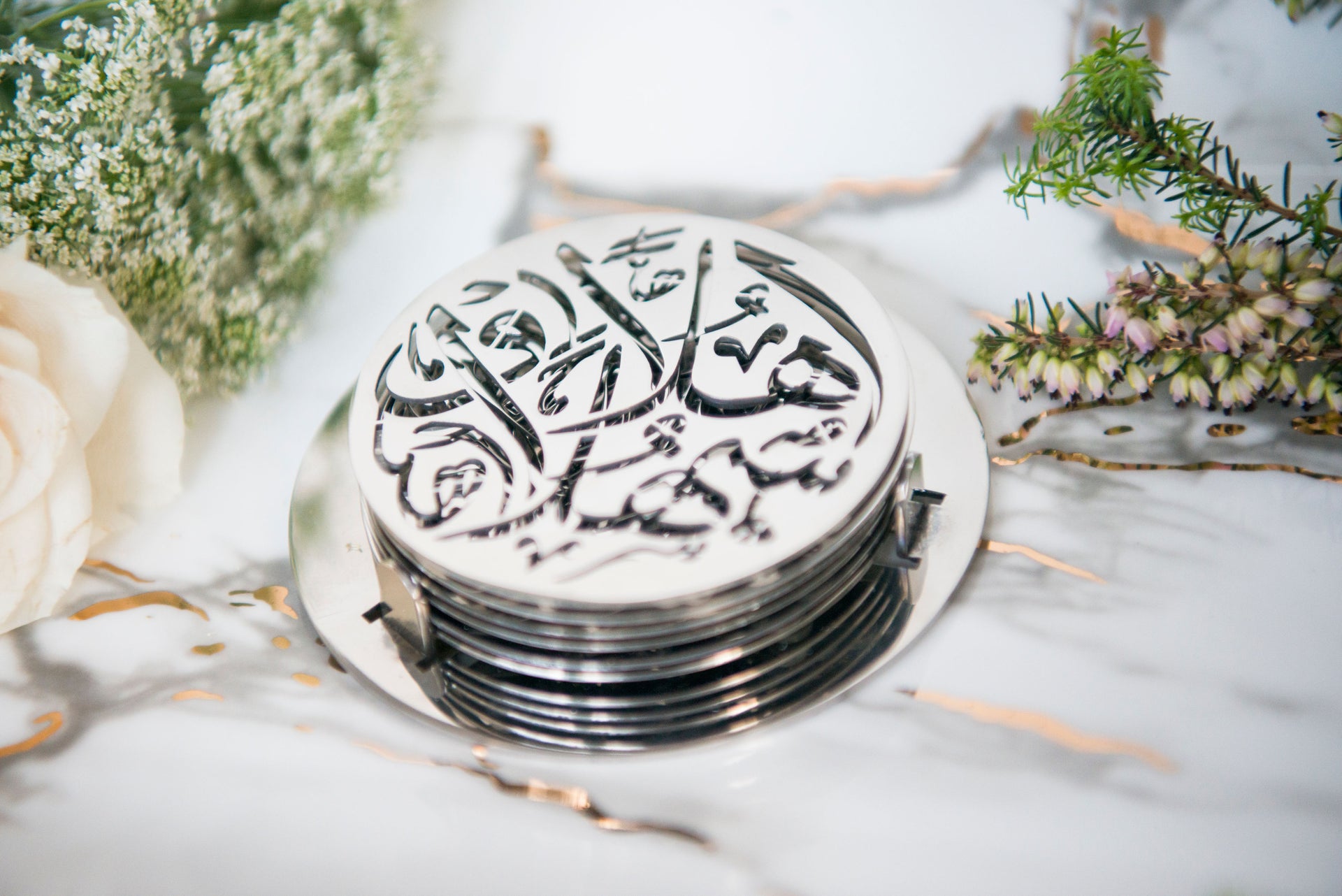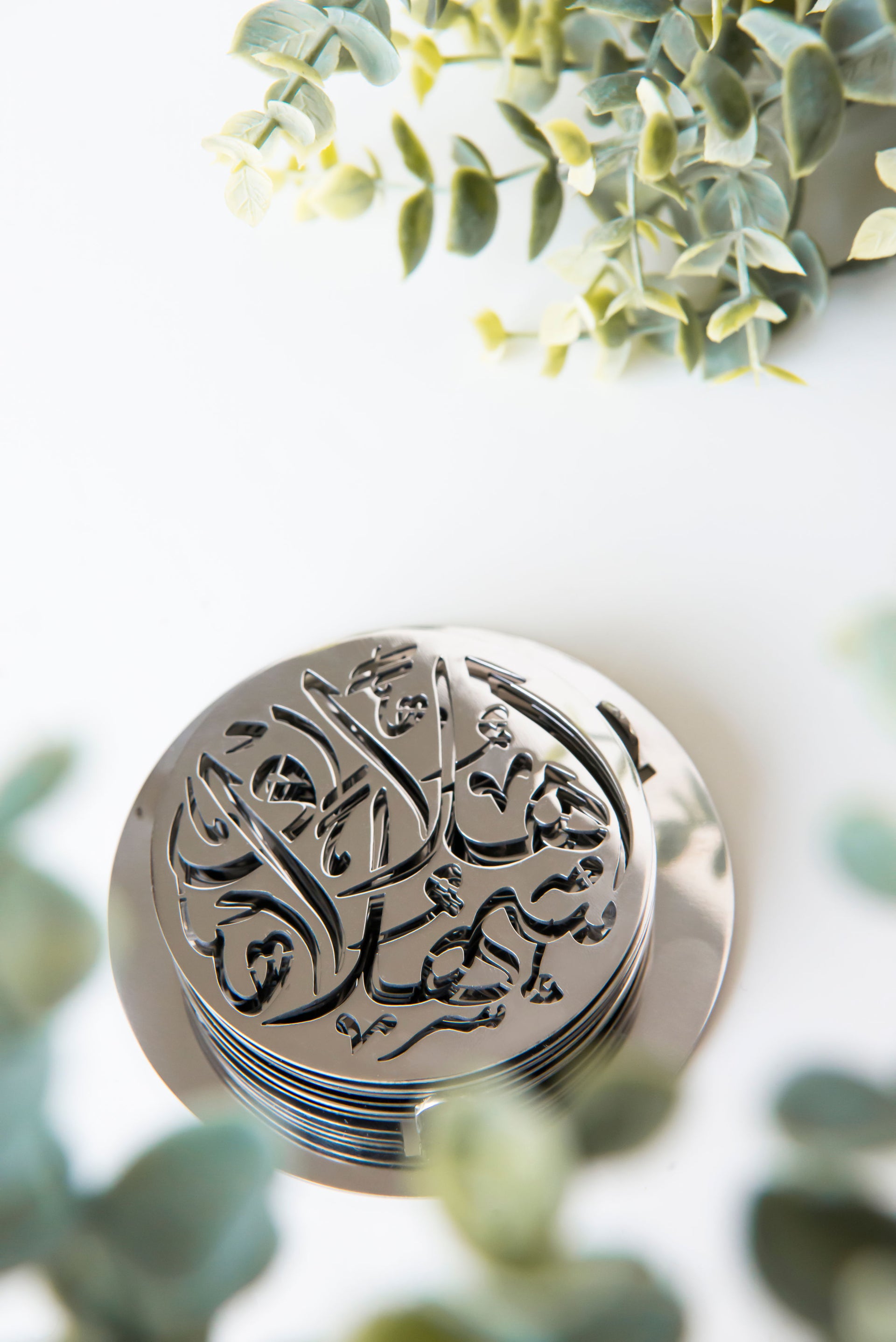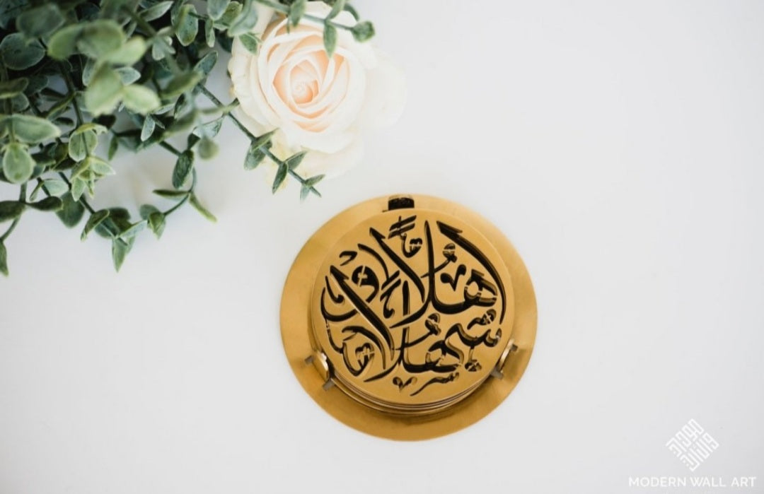 The Arabic words Ahlan wa Sahlan أَهْلًا وَسَهْلًا is a greeting. It’s both "Hello" and Welcome. When placed under the mug, it looks seamless due to the style of calligraphy. This is a very high quality product, with gel pads at the bottom to prevent from scratches on the surface.