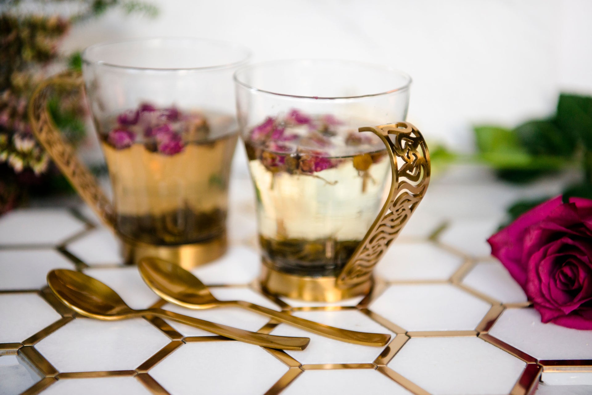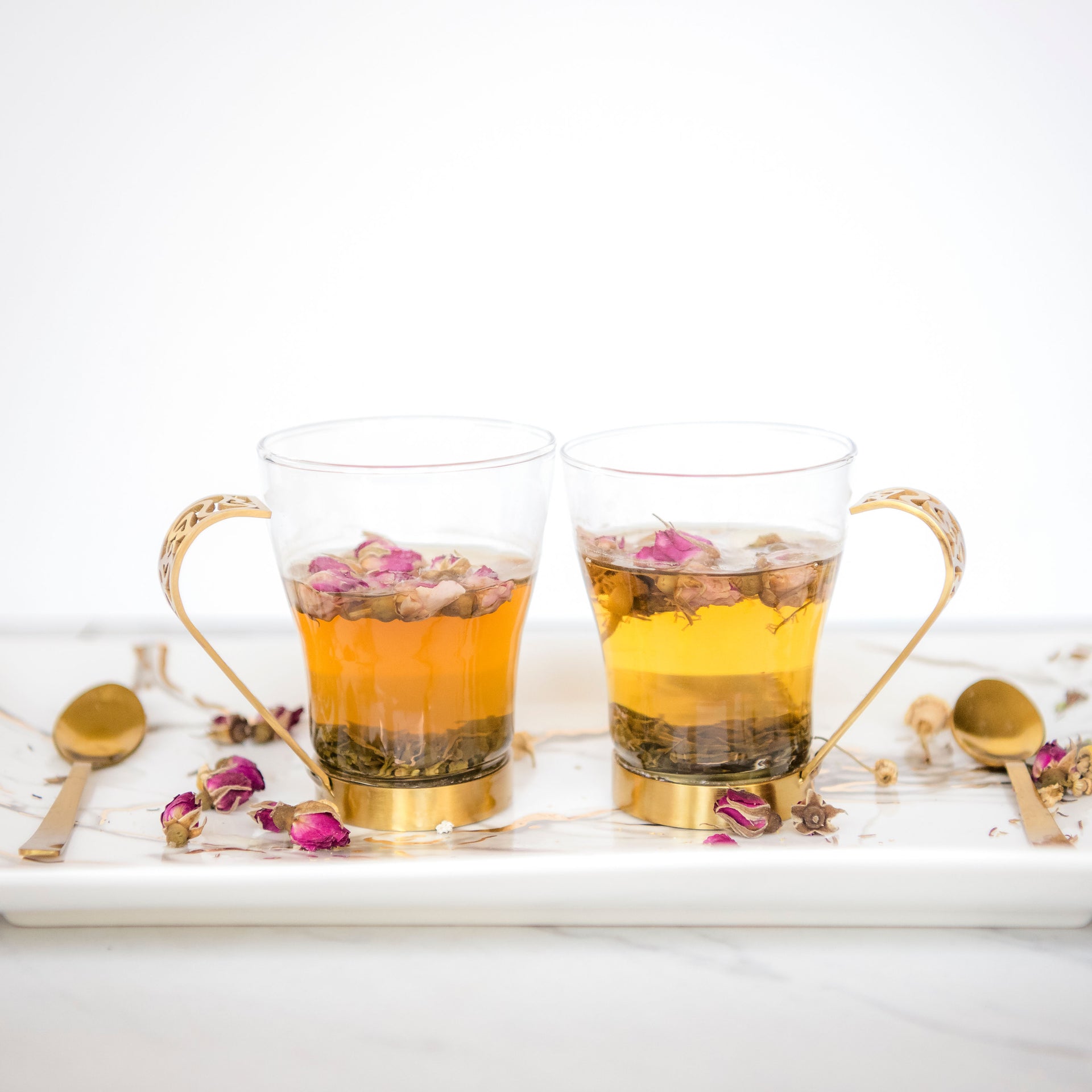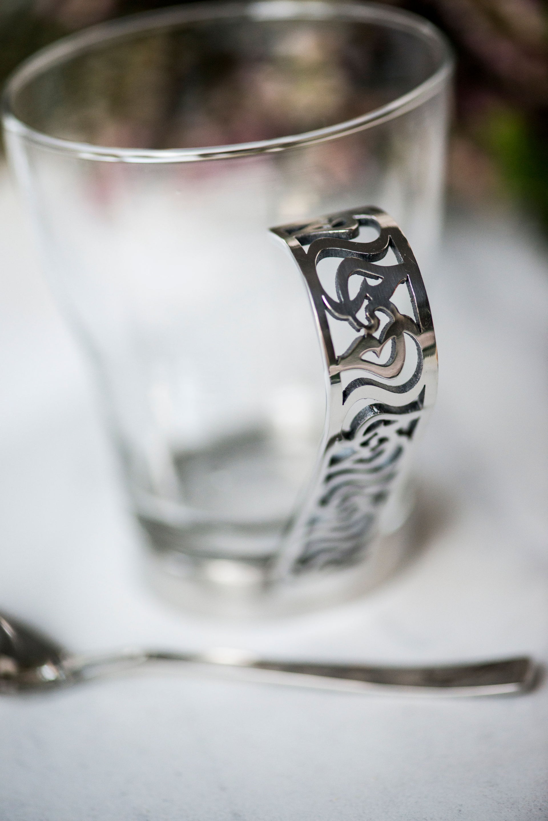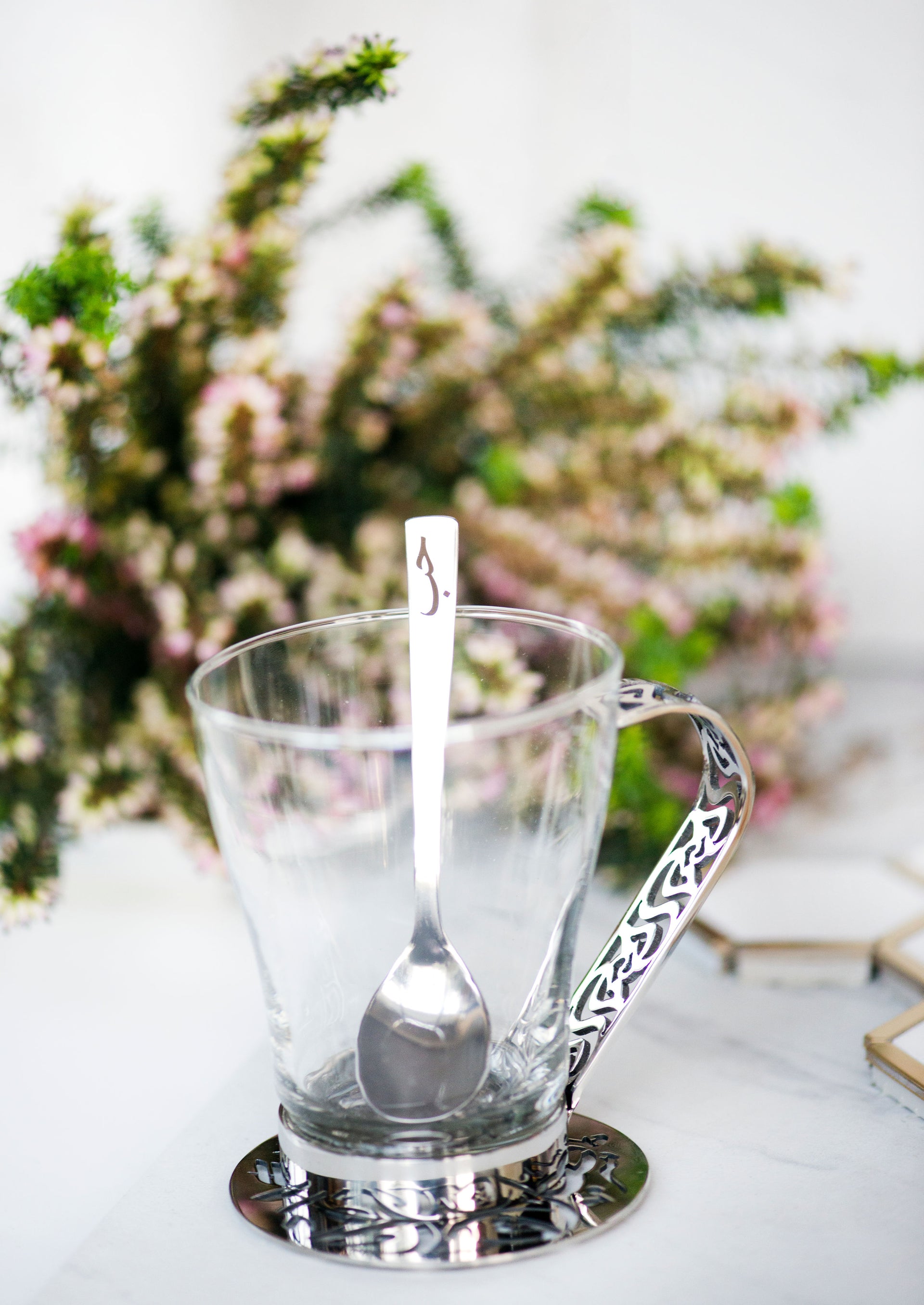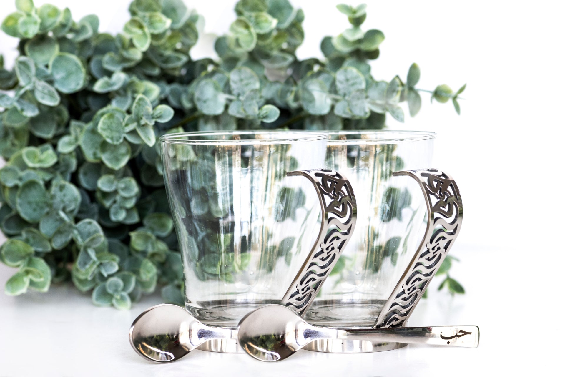Set of two glass mugs with stainless steel calligraphy hand that reads "Love" with two spoons with an engraving of the word "Love" in Arabic. Packaged in a gift box and ready to be gifted!