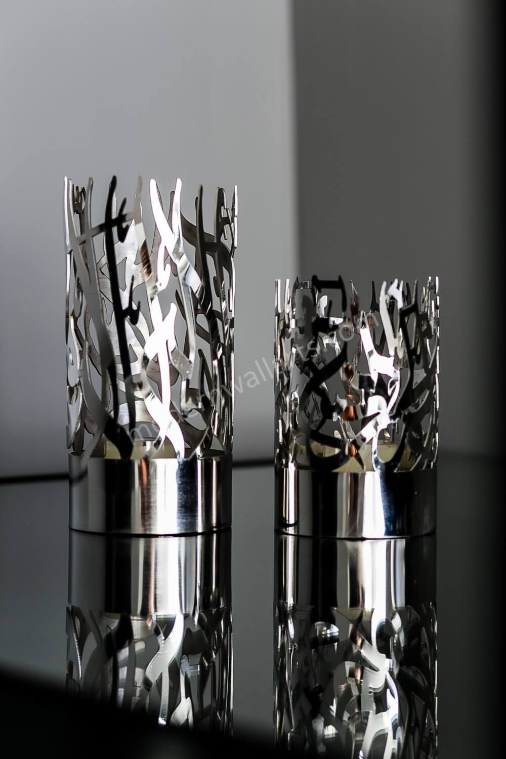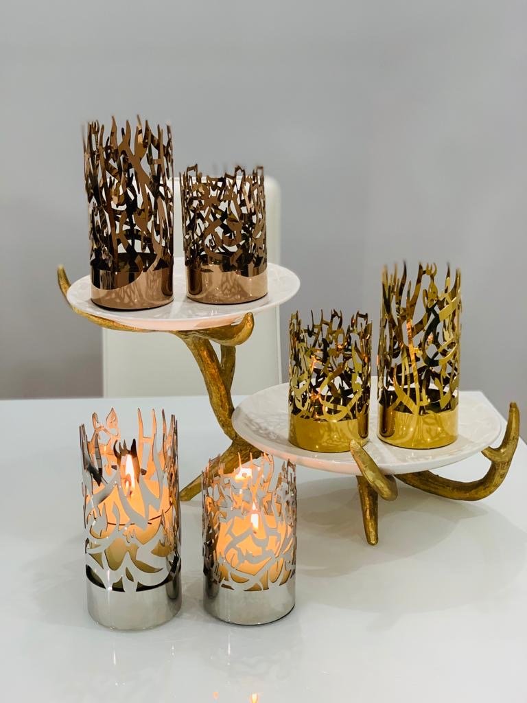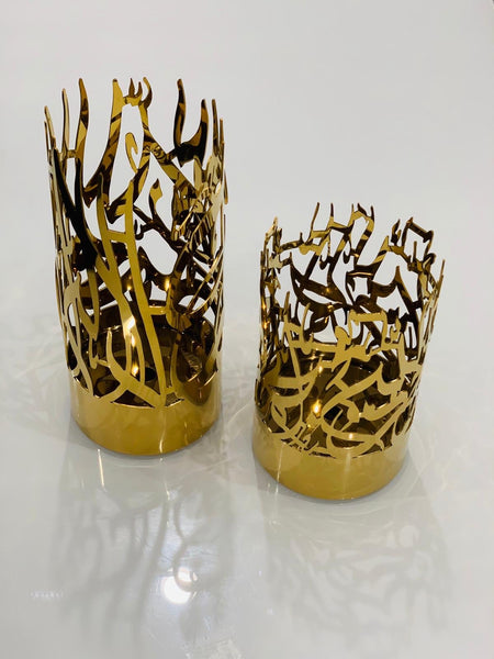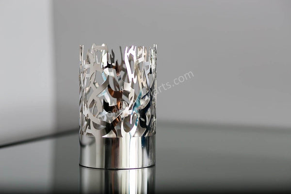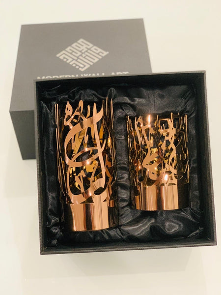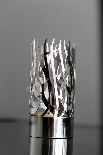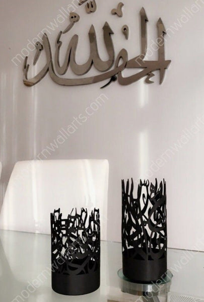 An elegant accent for any room. This set of stainless steel candle holders are the latest in our collection of unique Islamic décor. Each candle holder embodies the word Alhamdulillah (small holder) and the Kalmah (large holder) in beautiful Arabic calligraphy. The perfect gift option for your family and friends! If you have any questions, please feel free to message us before buying.
