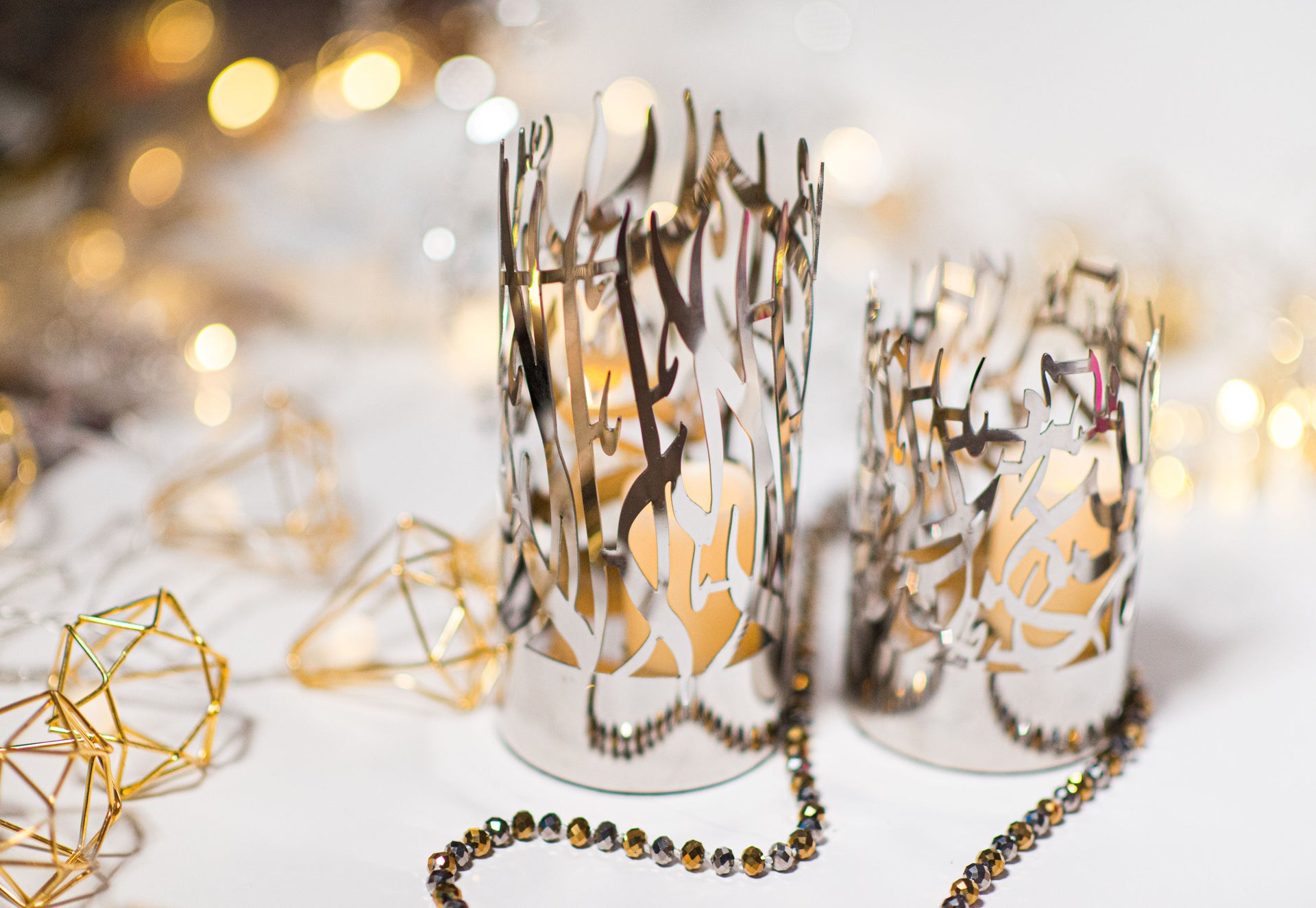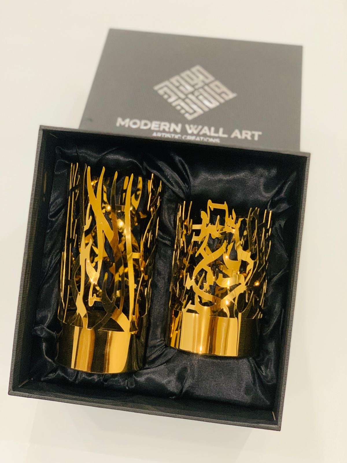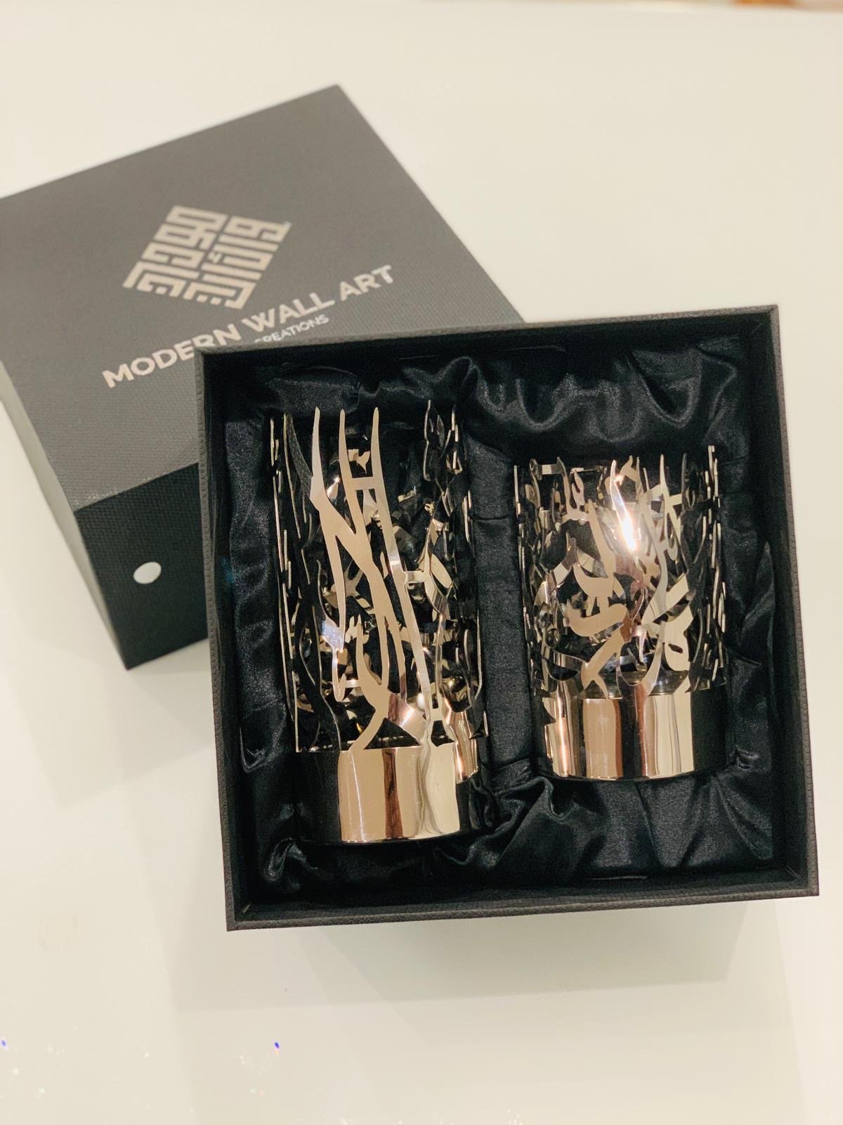An elegant accent for any room. This set of stainless steel candle holders are the latest in our collection of unique Islamic décor. Each candle holder embodies the word Alhamdulillah (small holder) and the Kalmah (large holder) in beautiful Arabic calligraphy. The perfect gift option for your family and friends! If you have any questions, please feel free to message us before buying.